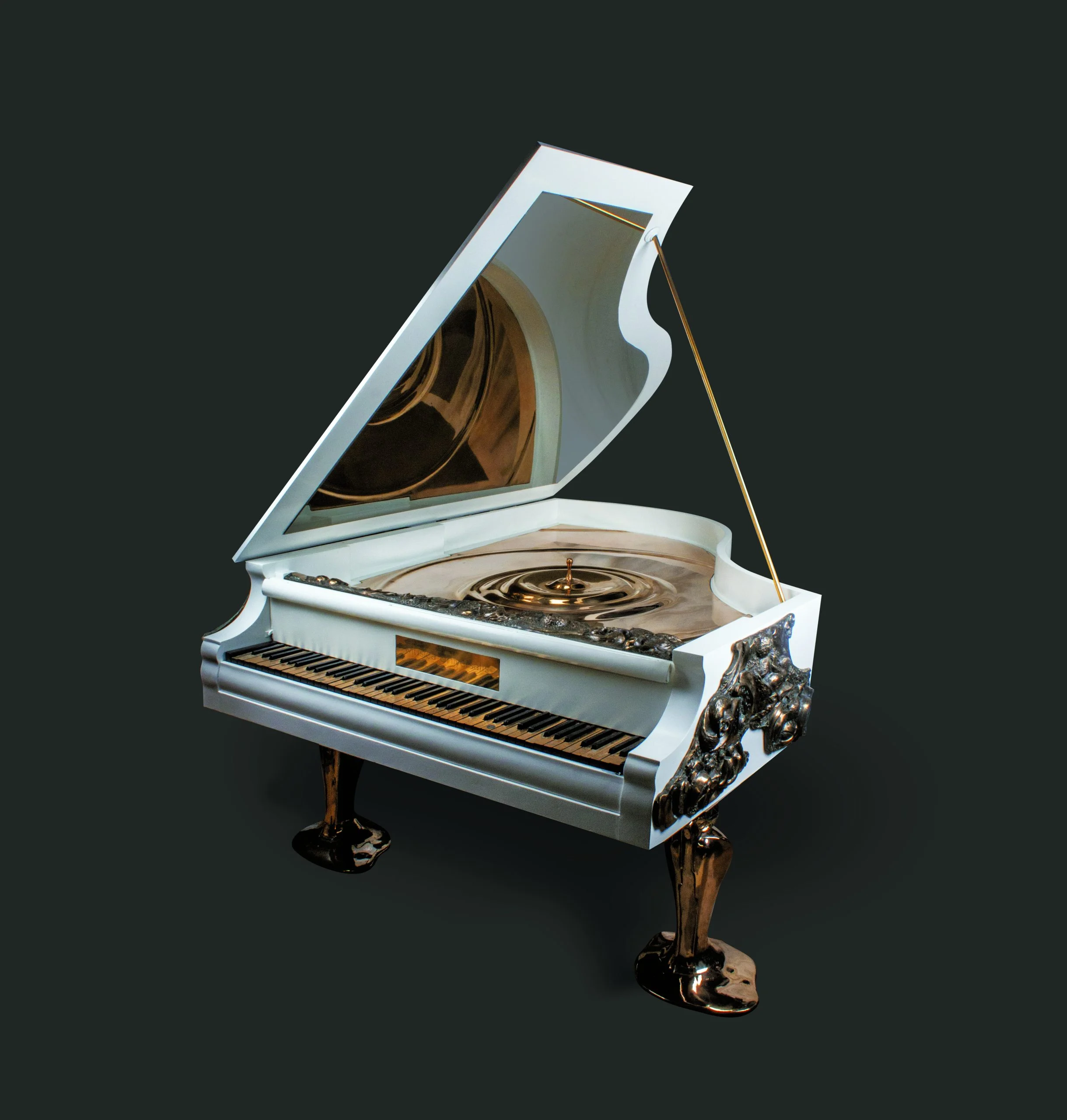 Menczel’s work is often characterized by its profound symbolic use of inscriptions, particularly seen in her signature series of sculptures that reference science and music, including the celebrated “Celestial Mechanics of Providence.” These intricate bronze forms are not just visual objects but intellectual journeys where inscriptions—formulas, dates, symbols—become an integral part of the storytelling. Her use of inscribed surfaces invites viewers to explore deeper philosophical and metaphysical questions. This reflective and multi-layered approach is particularly seen in her sculptural piano series, which incorporates not only physical beauty but also conceptual depth, linking celestial themes with the mechanics of sound and the cosmos.
